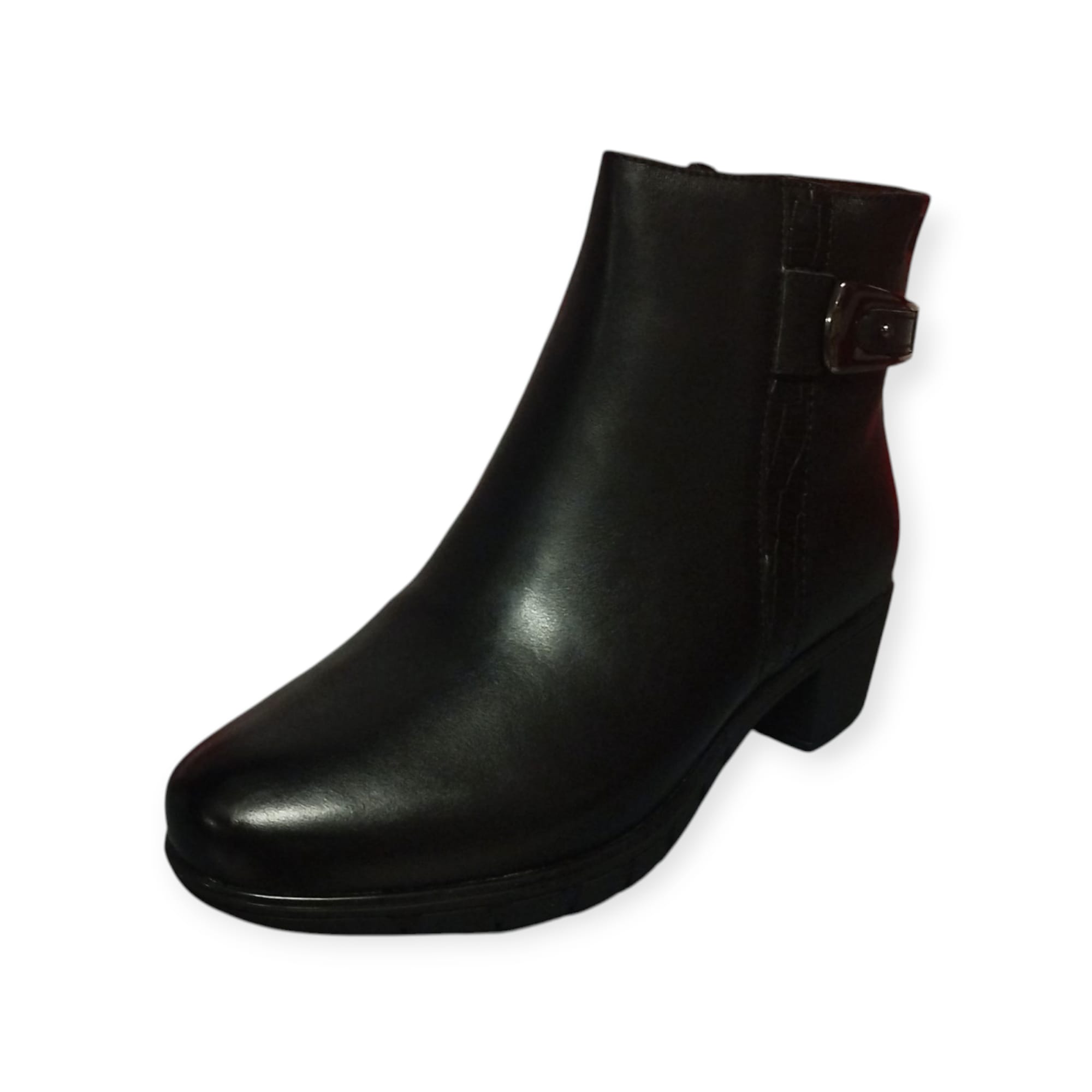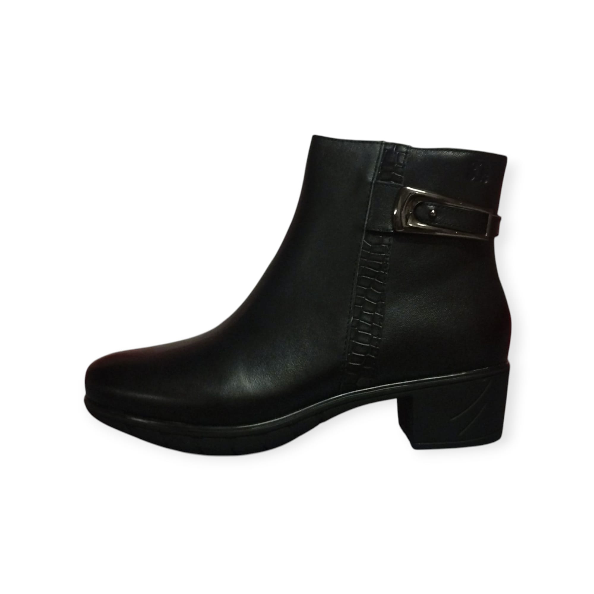 Botí de pell amb sivella, amb taló de 3 cm. Color negre